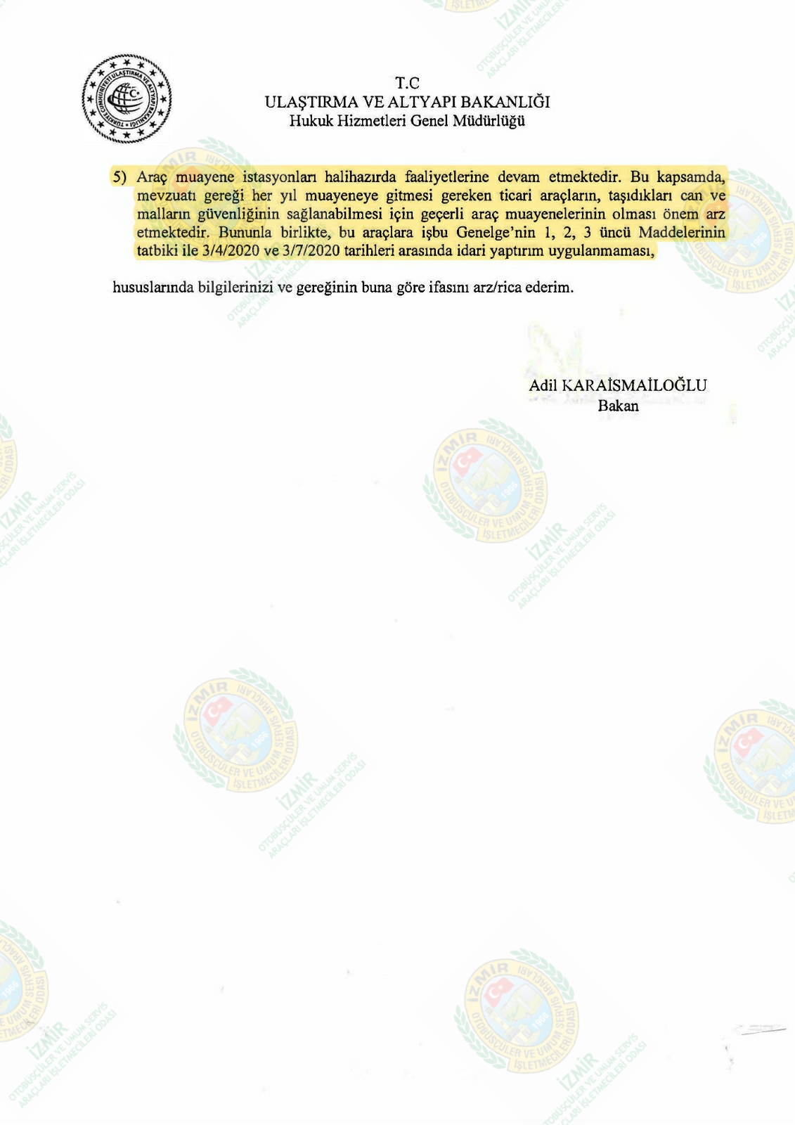 Ulaştırma ve Altyapı Bakanlığı’nın 2020/11 sayılı Genelgesi ile araç muayeneleri ile ilgili itirazlarımız dikkate alınmış ve 03.04.2020 – 03.07.2020 tarihleri arasında muayenesi olmayan araçlar için idari yaptırım (ceza) UYGULANMAMASINA karar verilmiştir.